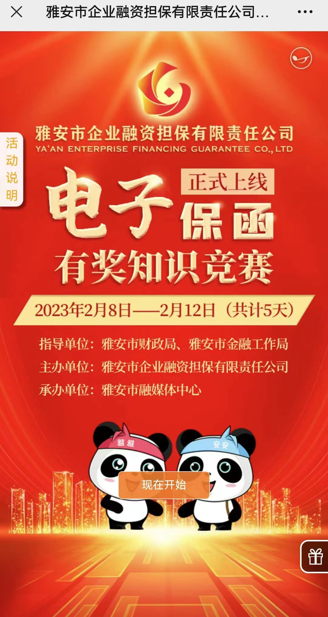 該活動由市財政局和市金融工作局指導(dǎo),雅安市企業(yè)融資擔(dān)保有限責(zé)任公司(以下簡稱“市擔(dān)保公司”)主辦,雅安市融媒體中心承辦。市擔(dān)保公司作為我市唯一一家政府性融資擔(dān)保機(jī)構(gòu),也是雅安公共資源交易中心上線的唯一一家本地全類別保函服務(wù)商。2月6日,市擔(dān)保公司“電子投標(biāo)保函”業(yè)務(wù)在雅安公共資源交易中心正式上線。為讓更多的受眾了解“電子投標(biāo)保函”業(yè)務(wù),市擔(dān)保公司主辦了此次線上有獎知識競賽活動。