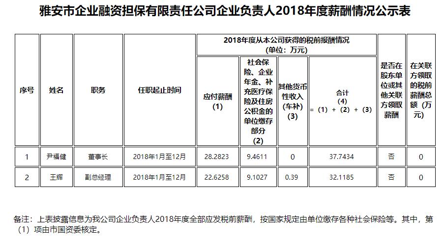 雅安市企業(yè)融資擔(dān)保有限責(zé)任公司企業(yè)負(fù)責(zé)人2018年度薪酬情況公示表