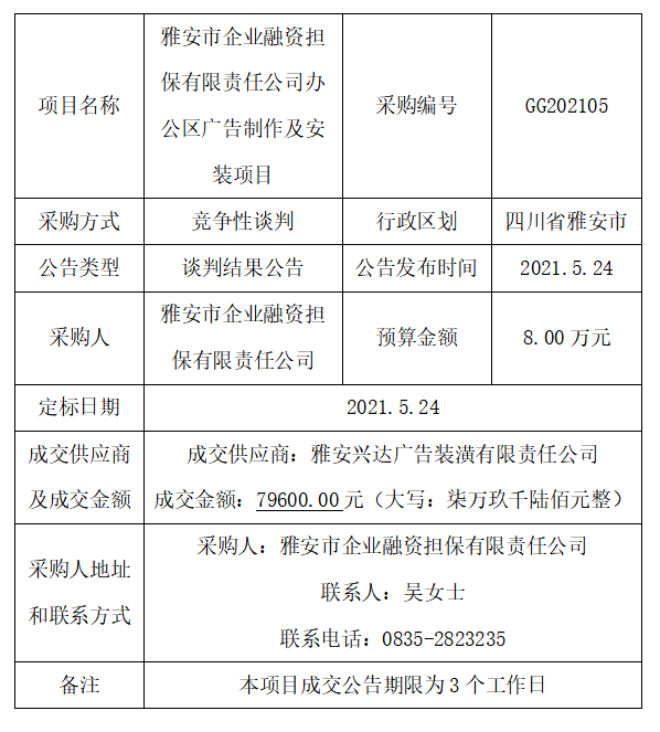 雅安市企業(yè)融資擔保有限責任公司辦公區(qū)廣告制作及安裝項目競爭性談判結(jié)果公告